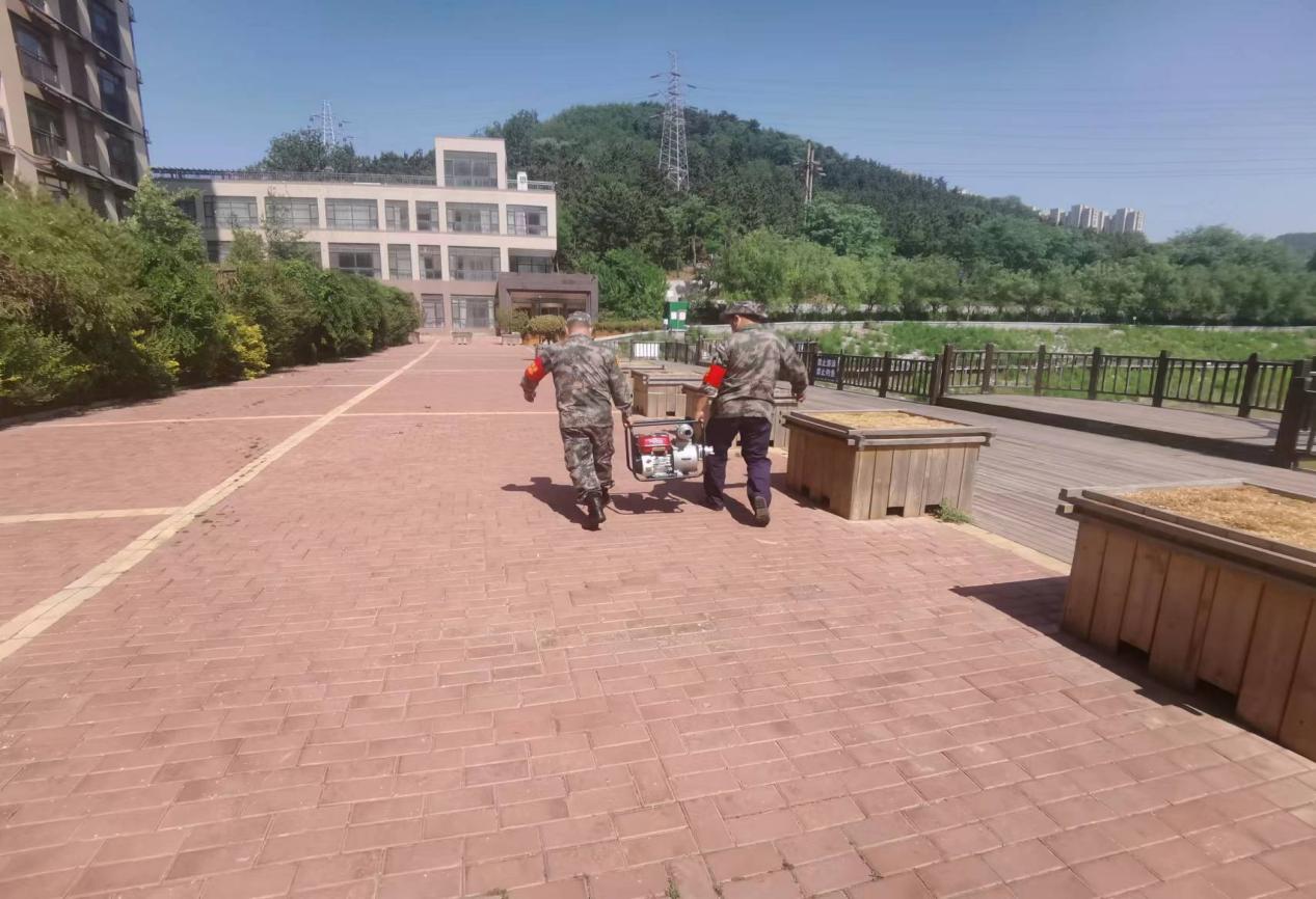 隨后又開展了抽水演練,隊員們在街道人員帶領下迅速展開抽水設備,搭建抽水通道,將溢入小區的“積水”排出去。